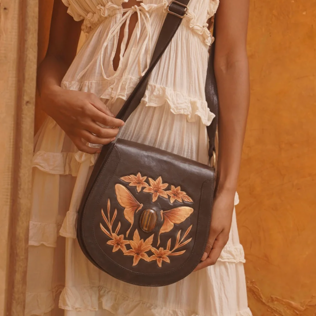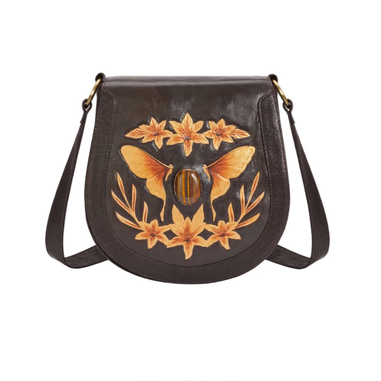 Stunning Jodi Lee hand-tooled and hand-painted Luna Moths and Lily Flowers surrounding a large Tigers Eye gemstone on a saddle bag style